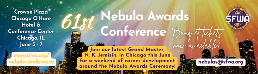 The 61st Nebula Awards Conference will be in Chicago, Illinois from June 2-7, 2026. Don’t miss out on special Early Discount pricing, which ends on May 1. Just $275 USD for in-person weekend registration.